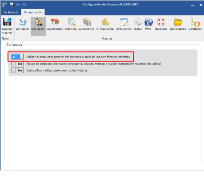 Configuración del sistema – De Aplicación – Aplicar el descuento general del contacto a nivel de linea en facturas emitidas