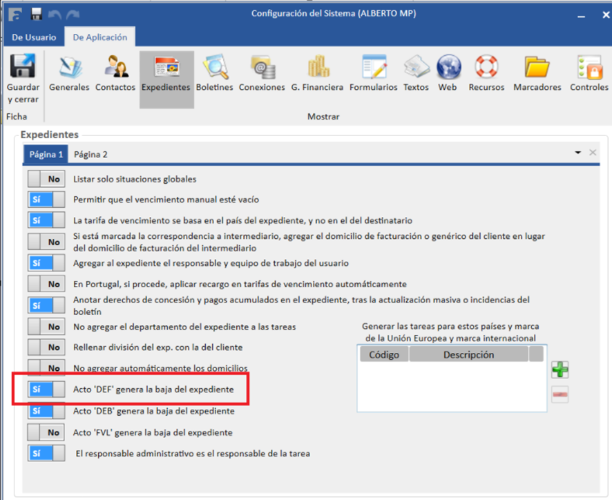 La aplicación Apiges Pro permite que un expediente pase al estado de baja al introducir el Acto “DEF”, siempre que dicha opción se encuentre habilitada en la ruta: Configuración del sistema → De Aplicación → Expedientes.