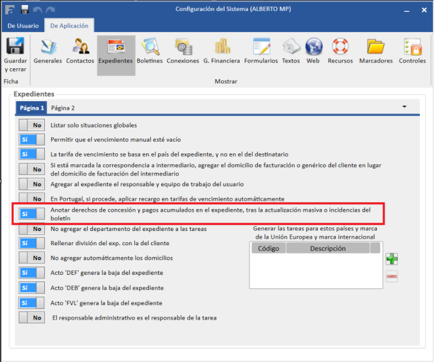 Esta opción se encuentra en Configuración del Sistema, dentro de la sección de configuración para Expedientes. Busca la opción relacionada con la actualización masiva y anotación de derechos de concesión y pagos.