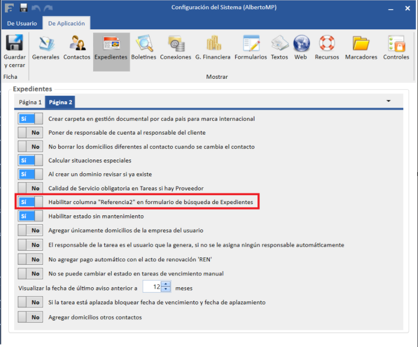 Cuando esta opción está activada, la columna Referencia2 aparece como una columna adicional en la pantalla de búsqueda de expedientes, permitiendo que vea el contenido del campo Referencia2 de cada expediente sin necesidad de abrirlo. Esto es útil cuando trabaja con referencias internas, códigos administrativos o clasificaciones secundarias que varían según los criterios de su despacho.