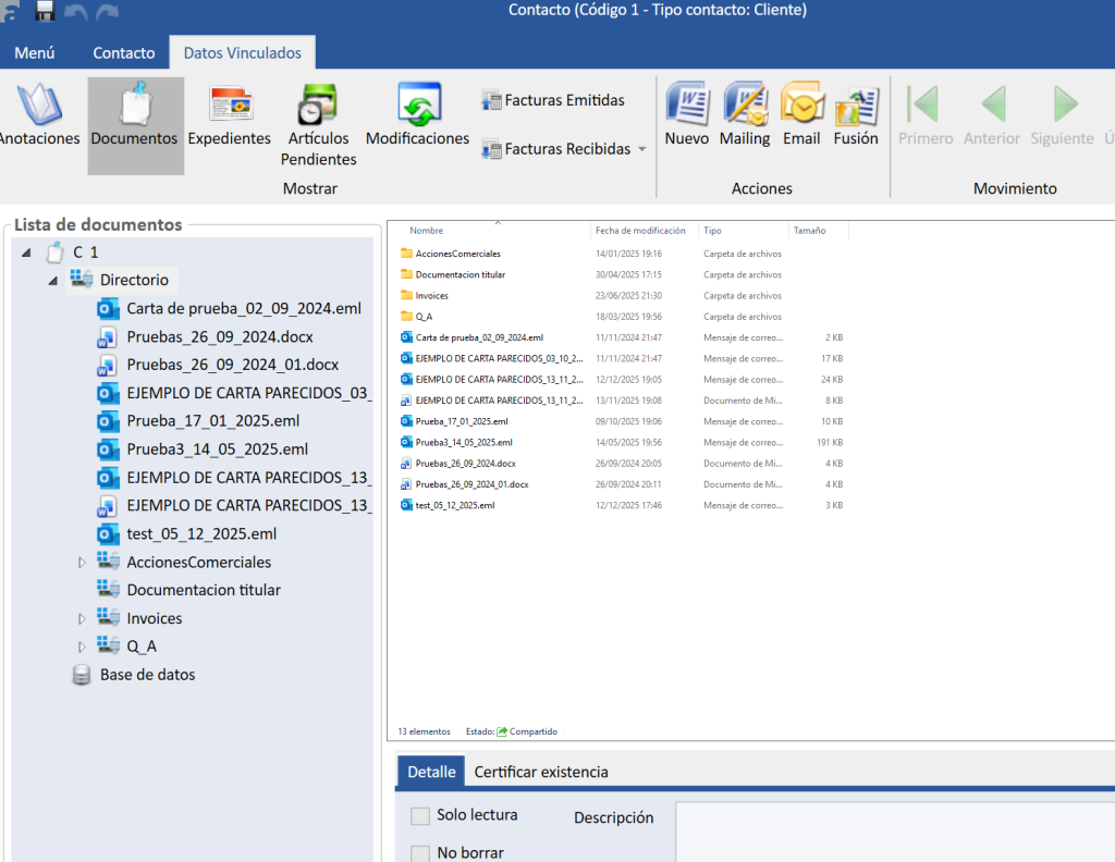 Posteriormente, si vamos a la pestaña de datos vinculados, documentos, nos aparecerán todos los ficheros asignados a nuestro cliente, y que también se mostraban en la misma ventana, que hemos visto anteriormente.
