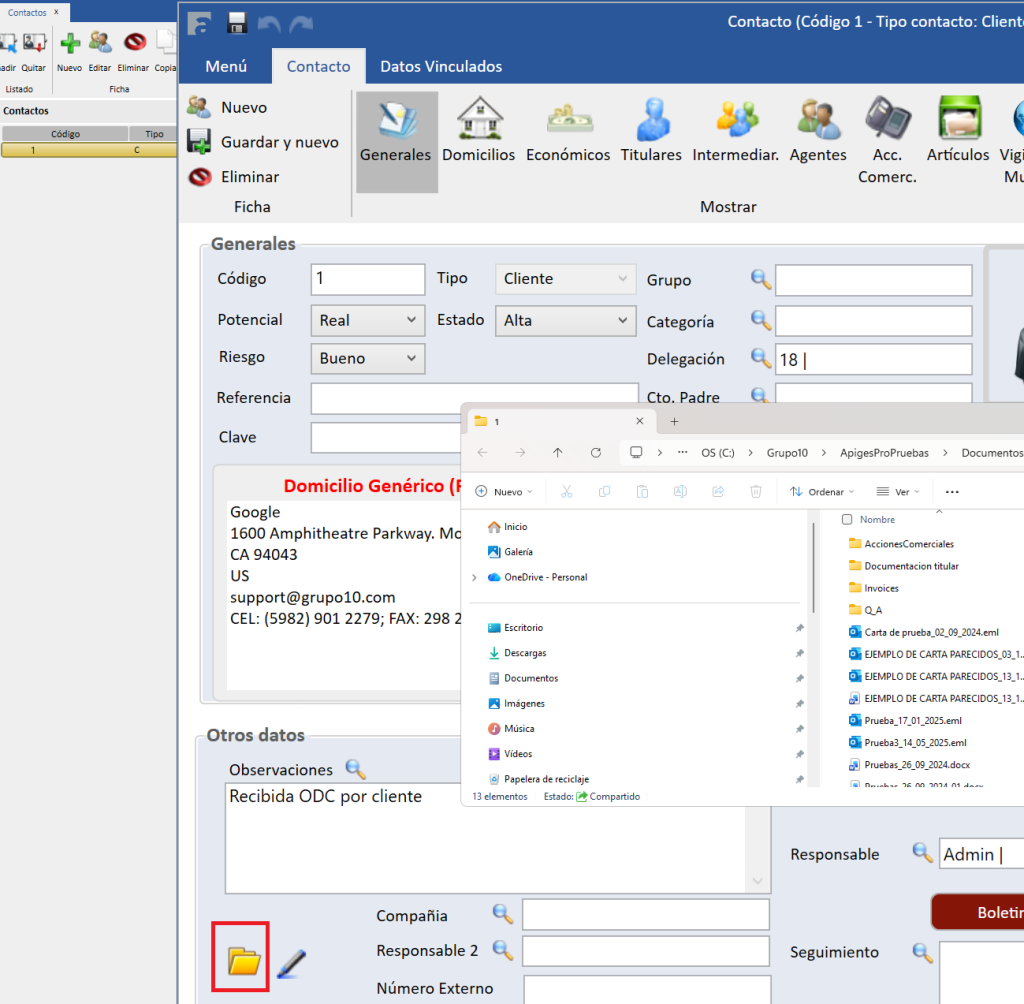 Si nos vamos a contactos, dentro de la pestaña de generales de la ficha de nuestro cliente, dispondremos del icono de una carpeta amarilla.