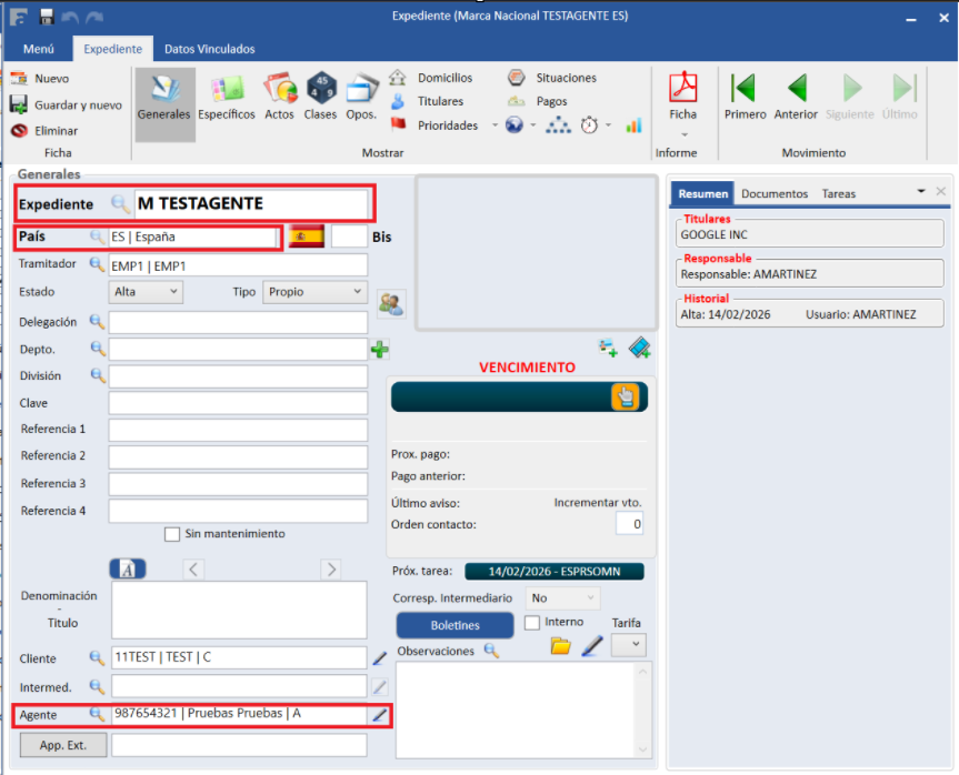 Al crear un expediente correspondiente a una M (Marca Nacional) y seleccionar España en el campo País, puede observarse que el sistema introduce automáticamente el agente previamente configurado en el apartado Otras Tablas.