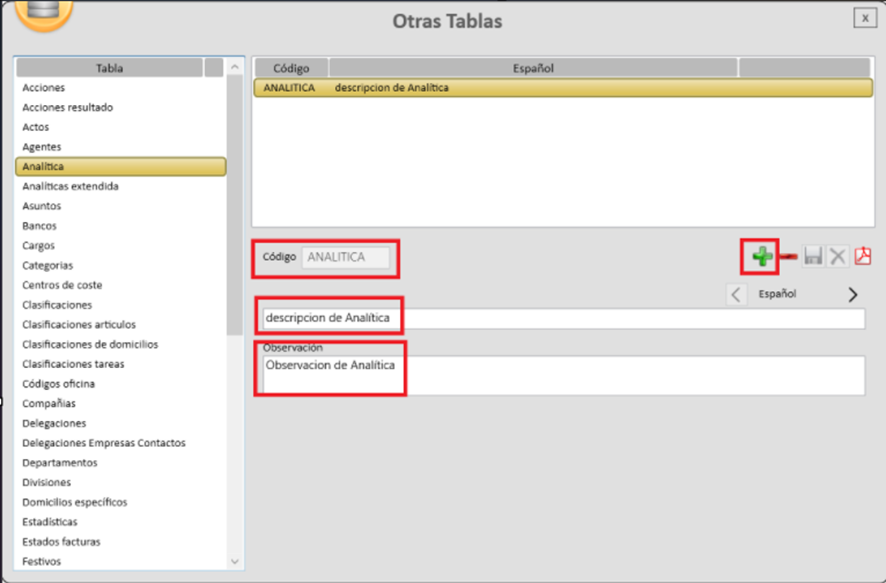 Para crear una analítica, es necesario hacer clic en el icono de la cruz verde (símbolo “+”) y cumplimentar los datos correspondientes. El campo Código es obligatorio y admite una longitud máxima de 10 caracteres. Los campos Descripción y Observaciones son de texto libre.