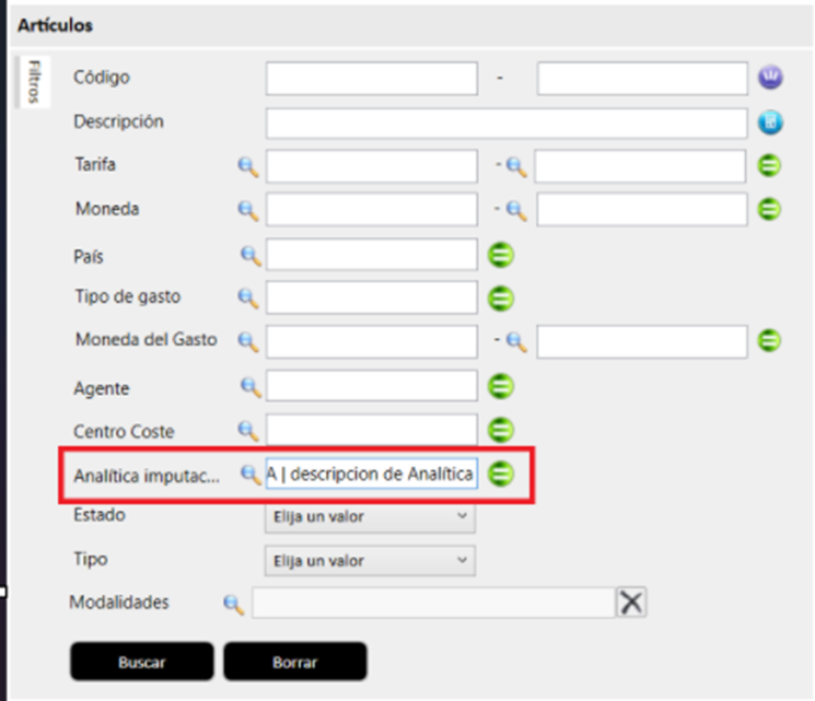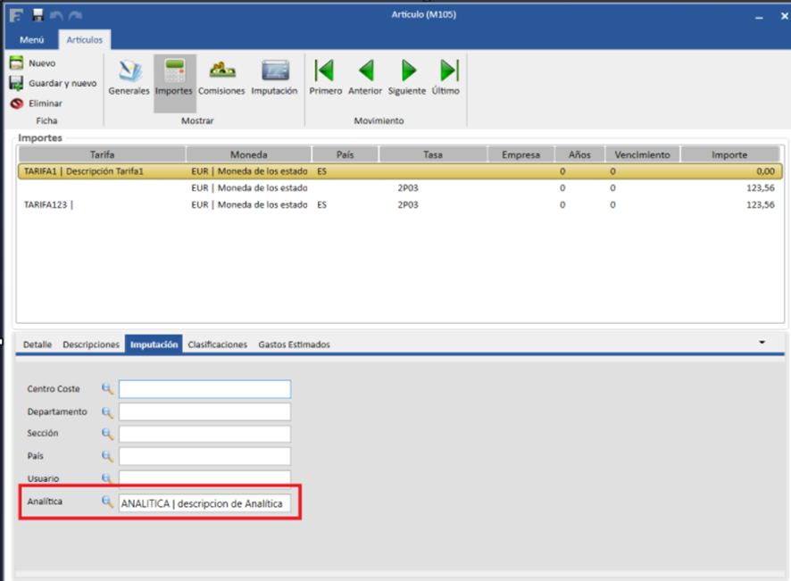 Para asignar esta analítica a un artículo, se debe acceder a la sección Artículos y, dentro de esta, a la pestaña Importes → Imputación. Al pulsar en el icono de la lupa, se mostrará un listado desde el cual se podrá seleccionar la analítica deseada.