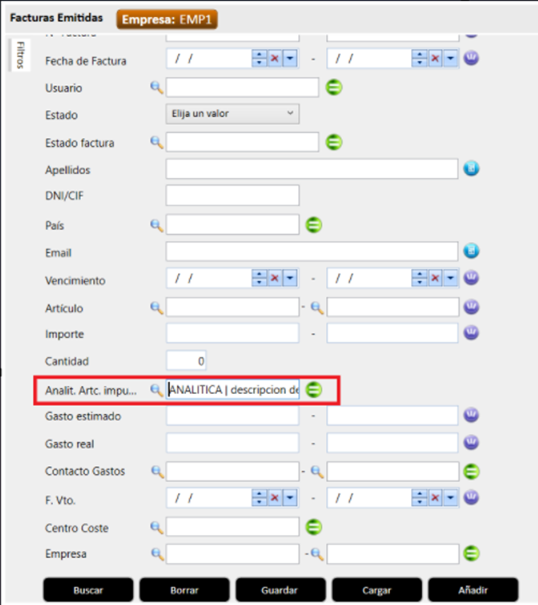 Del mismo modo, la búsqueda puede realizarse desde el apartado de facturas para identificar aquellas que tengan vinculada una analítica específica.