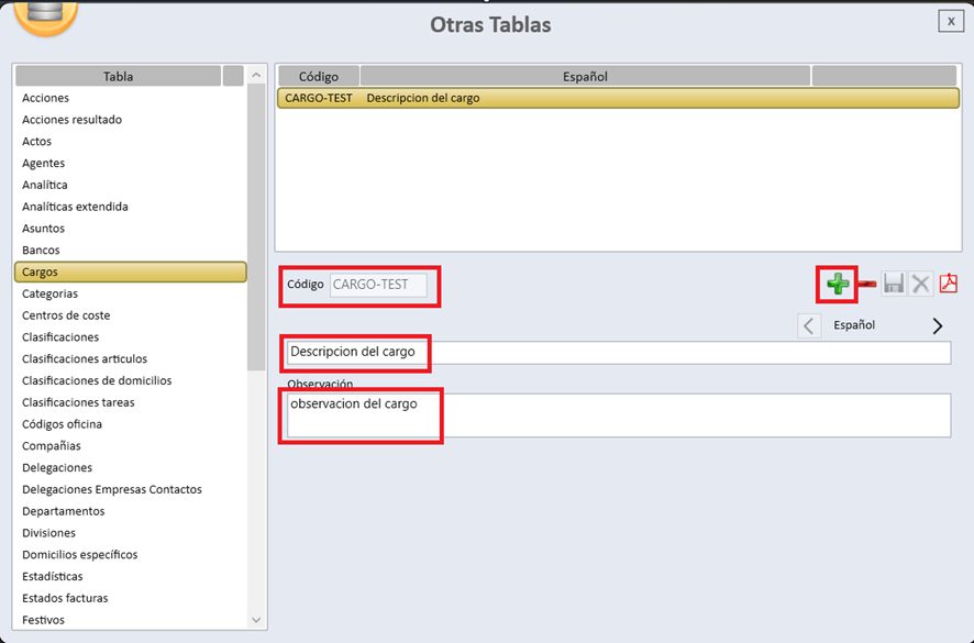Para crear un cargo, es necesario hacer clic en el símbolo de la cruz verde (icono “+”) y cumplimentar los siguientes campos: Código, con una longitud máxima de 10 caracteres y de carácter obligatorio; así como los campos Descripción y Observaciones, que admiten texto libre. Una vez completada la información, será imprescindible guardar los datos para que los cambios queden debidamente registrados.