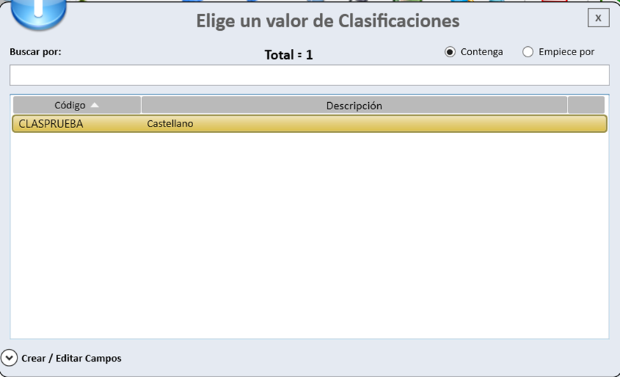 Al hacer clic en el icono de la lupa, se abre una nueva ventana que muestra el listado de las clasificaciones existentes. Desde esta misma ventana, se pueden crear nuevas clasificaciones o modificar las ya existentes mediante la opción Crear / Editar Campos.