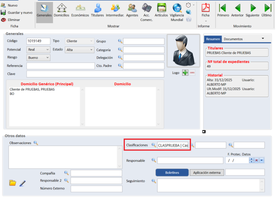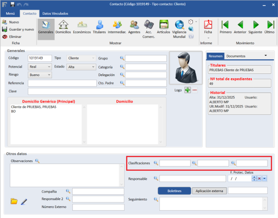 Cabe destacar que es posible asignar hasta tres clasificaciones a cada contacto, utilizando los distintos apartados disponibles y accediendo a cada uno de ellos mediante el icono de la lupa correspondiente.