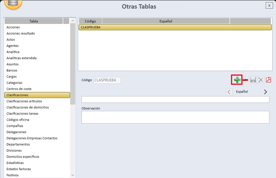 Para crear una nueva clasificación, es necesario acceder al menú Otras Tablas → Clasificaciones. Una vez allí, al pulsar sobre el icono de la cruz verde (símbolo “+”), se habilita la opción para crear una nueva clasificación.