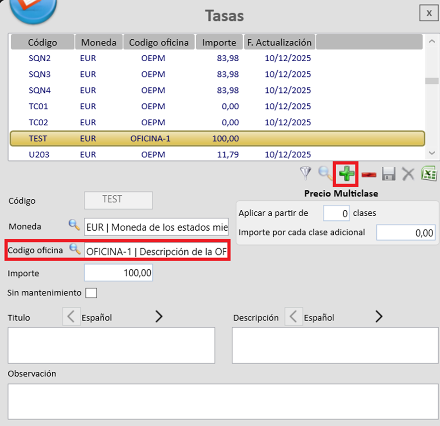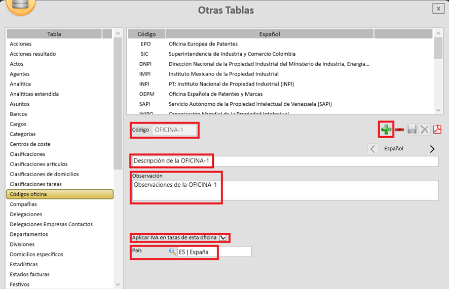 Para crear un código de oficina, es necesario hacer clic en el símbolo de la cruz verde (icono “+”) y completar los datos requeridos. El campo Código es obligatorio y admite una longitud máxima de 10 caracteres. Los campos Descripción y Observación son de texto libre. Asimismo, se dispone de la opción de marcar la casilla para aplicar el IVA a las tasas asociadas a dicha oficina, así como de añadir un País correspondiente.