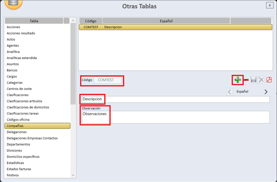 Para crear una compañía, es necesario hacer clic en el icono de la cruz verde (símbolo “+”) y cumplimentar los datos requeridos: el campo Código, obligatorio y con una longitud máxima de 10 caracteres; así como los campos Descripción y Observaciones, que son opcionales y admiten texto libre. Para finalizar, será imprescindible guardar la información a fin de que los cambios queden debidamente registrados.