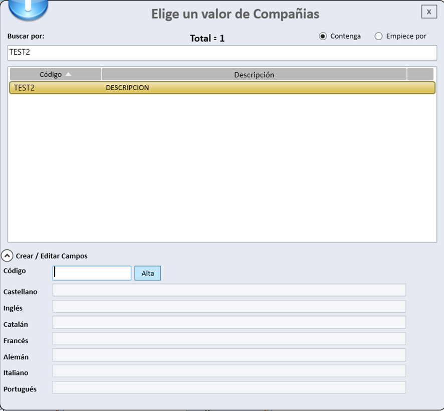 Desde esta misma ventana, también es posible editar o crear nuevas compañías. Para ello, se debe pulsar en la opción Crear / Editar Campos, seleccionar Alta y cumplimentar los datos correspondientes a la nueva compañía.