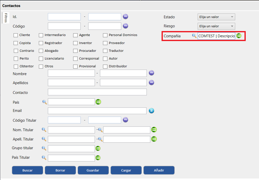 Para asignar una compañía a un contacto, se debe acceder al apartado Contactos y pulsar en el icono de la lupa correspondiente. Se abrirá una ventana con las compañías previamente creadas, desde la cual se podrá seleccionar la deseada mediante doble clic.