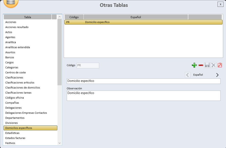 Para crear un domicilio específico es necesario hacer clic en el icono de la cruz verde (símbolo “+”) y cumplimentar los datos requeridos. El campo Código es obligatorio y tiene una longitud máxima de 2 caracteres. Los campos Descripción y Observaciones son de texto libre. Una vez completada la información, será imprescindible guardar los datos para que los cambios queden debidamente registrados.