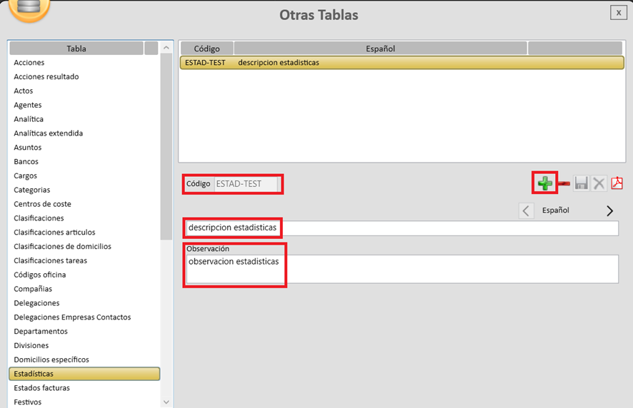 Para crear una estadística, es necesario hacer clic en el icono de la cruz verde (símbolo “+”) y cumplimentar los datos requeridos. El campo Código es obligatorio y admite una longitud máxima de 10 caracteres. Los campos Descripción y Observaciones son de texto libre.