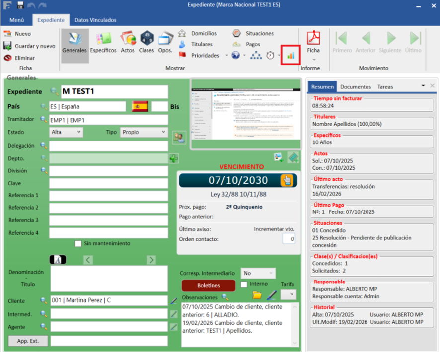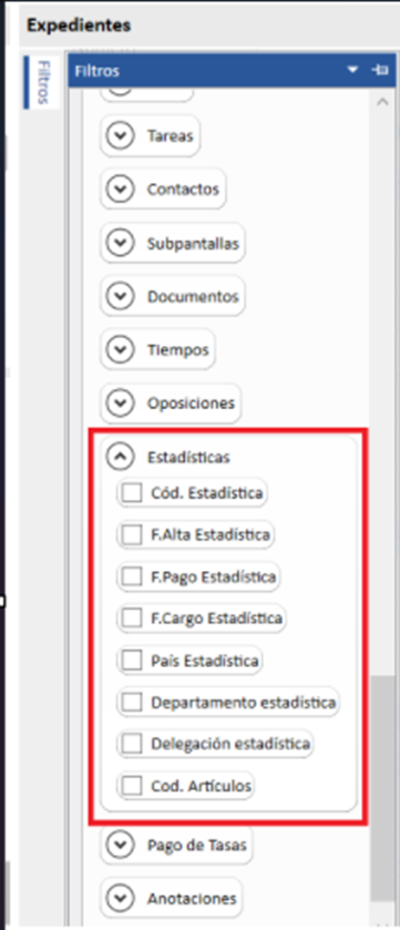 Para asignar una estadística a un expediente, se debe acceder a la sección de Expedientes y, dentro de esta, a la pestaña Estadísticas, lo que abrirá una ventana específica.