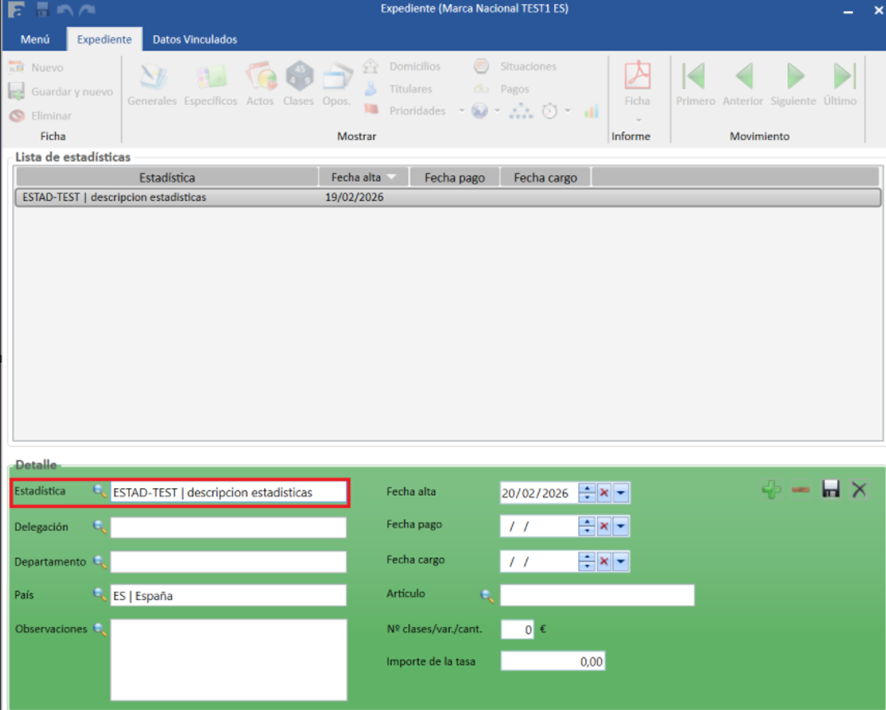 En dicha ventana, mediante el icono de la lupa situado en el campo de estadísticas, se podrá seleccionar la estadística deseada y asociarla al expediente correspondiente.