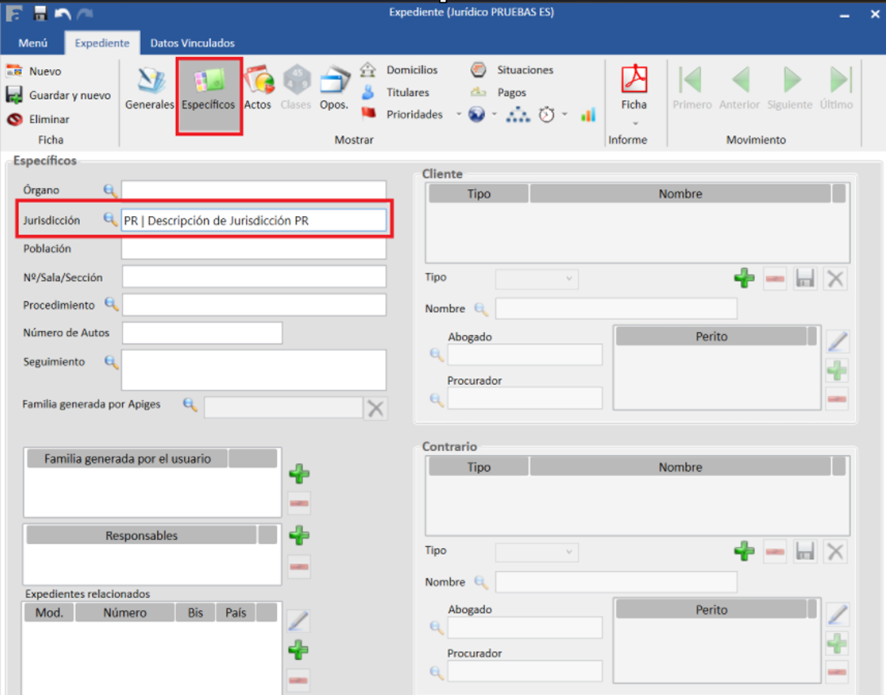 Una vez creadas, a nuestros expedientes de modalidad JUR podemos agregarles estas jurisdicciones, accedemos a un expediente y en la pestaña de Específicos, pulsamos en el campo de jurisdicción sobre el icono de la lupa para que muestre el listado de todas las posibles, seleccionamos la deseada y pulsamos en guardar para que los cambios se queden guardados.