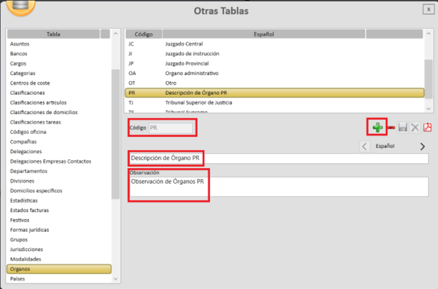 Apiges Pro permite crear órganos para asignarlos a los expedientes con modalidad JUR. Para ello, es necesario hacer clic en el icono “+” (símbolo de la cruz verde) y cumplimentar los datos correspondientes. El campo Código es obligatorio y debe tener una longitud de 2 caracteres. Los campos Descripción y Observación son de texto libre.