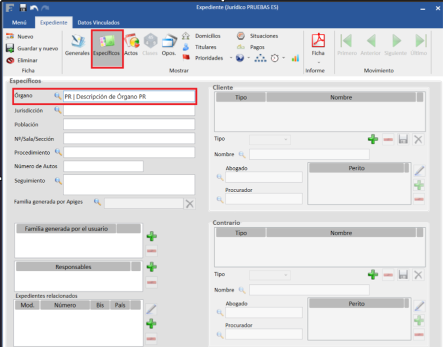 Para incorporar un órgano a un expediente, se debe acceder al expediente correspondiente y dirigirse a la pestaña Específicos. A continuación, se debe pulsar sobre el icono de la lupa en el campo Órgano, lo que mostrará un listado de los órganos disponibles para su selección.