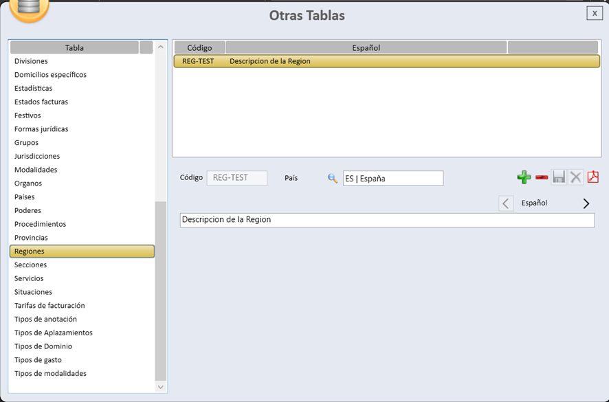 Para crear una región, es necesario hacer clic en el símbolo de la cruz verde (icono “+”). Posteriormente, se deberán cumplimentar los siguientes datos: el Código, con una longitud máxima de 10 caracteres; el País en el que se encuentra la región; y el campo Descripción, que admite texto libre. Finalmente, será imprescindible guardar la información para que los cambios queden registrados de forma permanente.