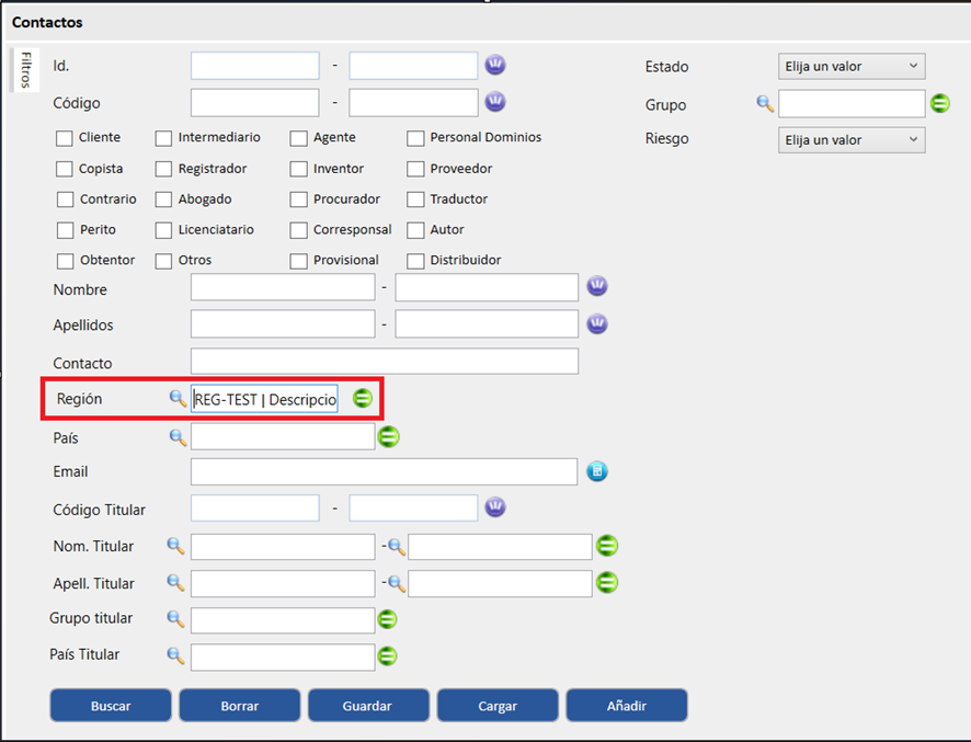 Para asignar una región a un contacto, se debe acceder al apartado Domicilios y pulsar en la lupa situada en el campo Región. Se abrirá una ventana que mostrará las regiones previamente creadas. Por último, mediante doble clic sobre la región deseada, esta quedará seleccionada.
